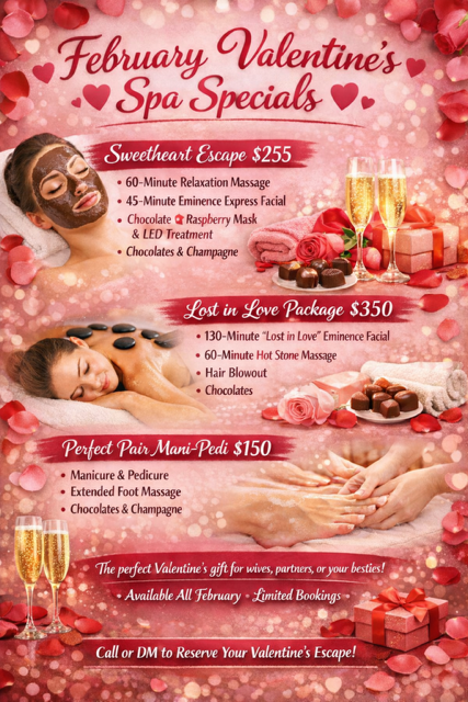 February Valentine’s Spa Specials Love is in the air all month long at the spa… treat yourself or someone special to the ultimate relaxation experience. Sweetheart Escape — $255• 60-Minute Relaxation Massage • 45-Minute Eminence Express Facial Chocolate or Raspberry Mask • LED Treatment • Chocolates & Champagne Lost in Love Package —...